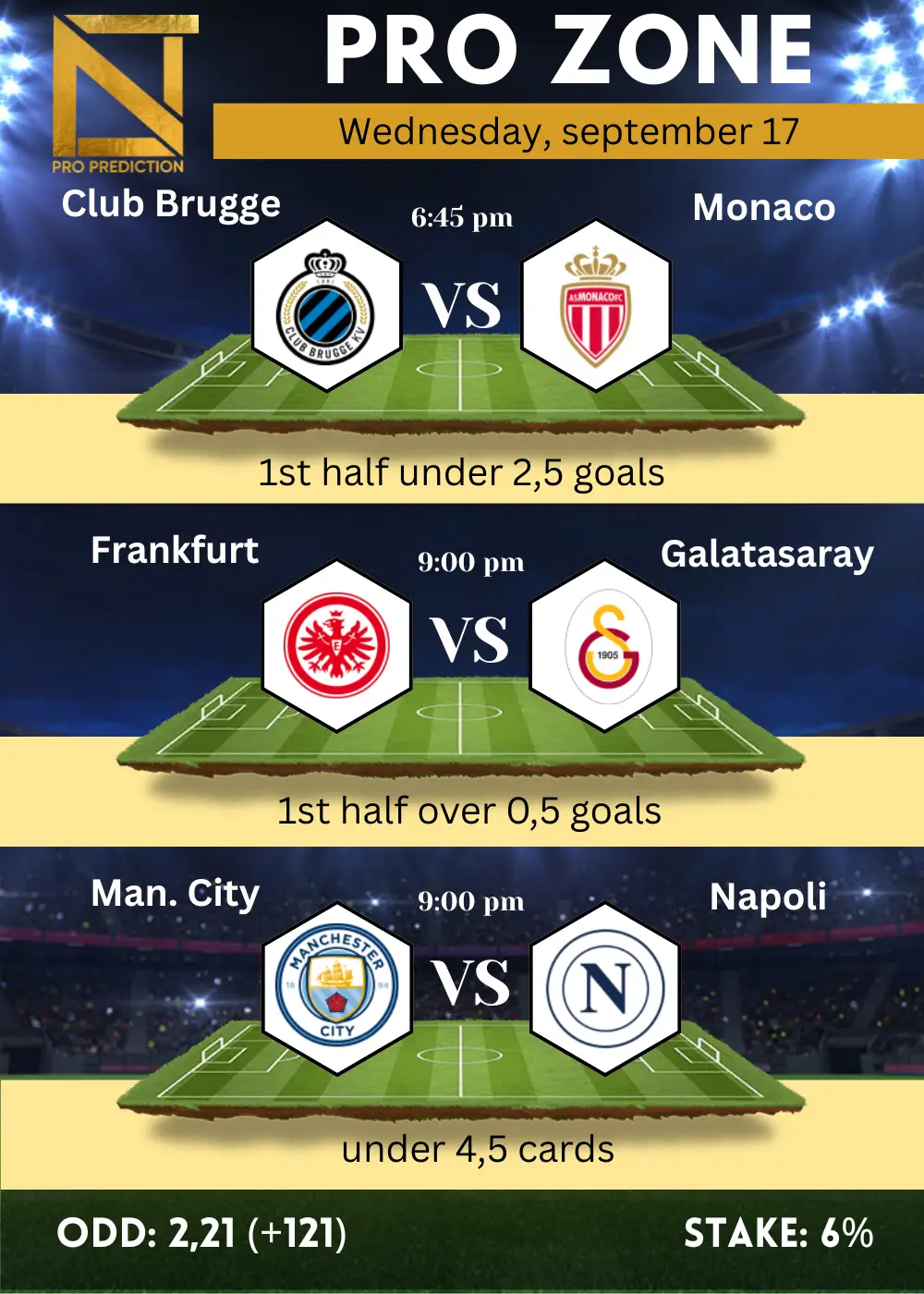 RESULTS & STATUS Club Brugge – Monaco 4:1 (3:0) Man. City – Napoli 2 cards Frankfut – Galatasaray 5:1 (3:1) LOSS: -6%